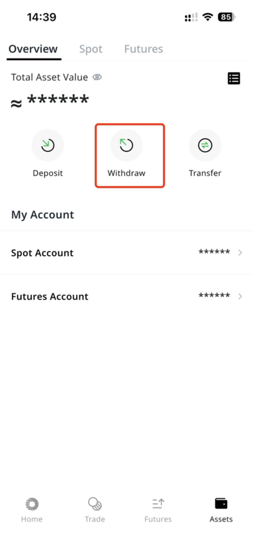 - Log in to the RooEx app, go to the 【Assets】 page in the lower right corner, and tap 【Withdraw】. Note: Only assets in the 【Spot 】account can be withdrawn. Assets in the 【Futures 】account must first be 【Transfer】 to the 【Spot 】 Account before withdrawal.