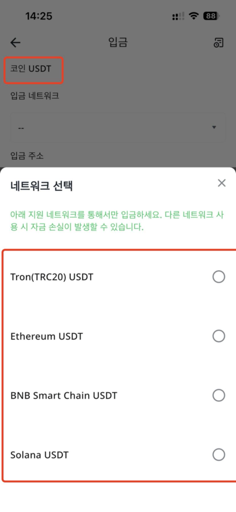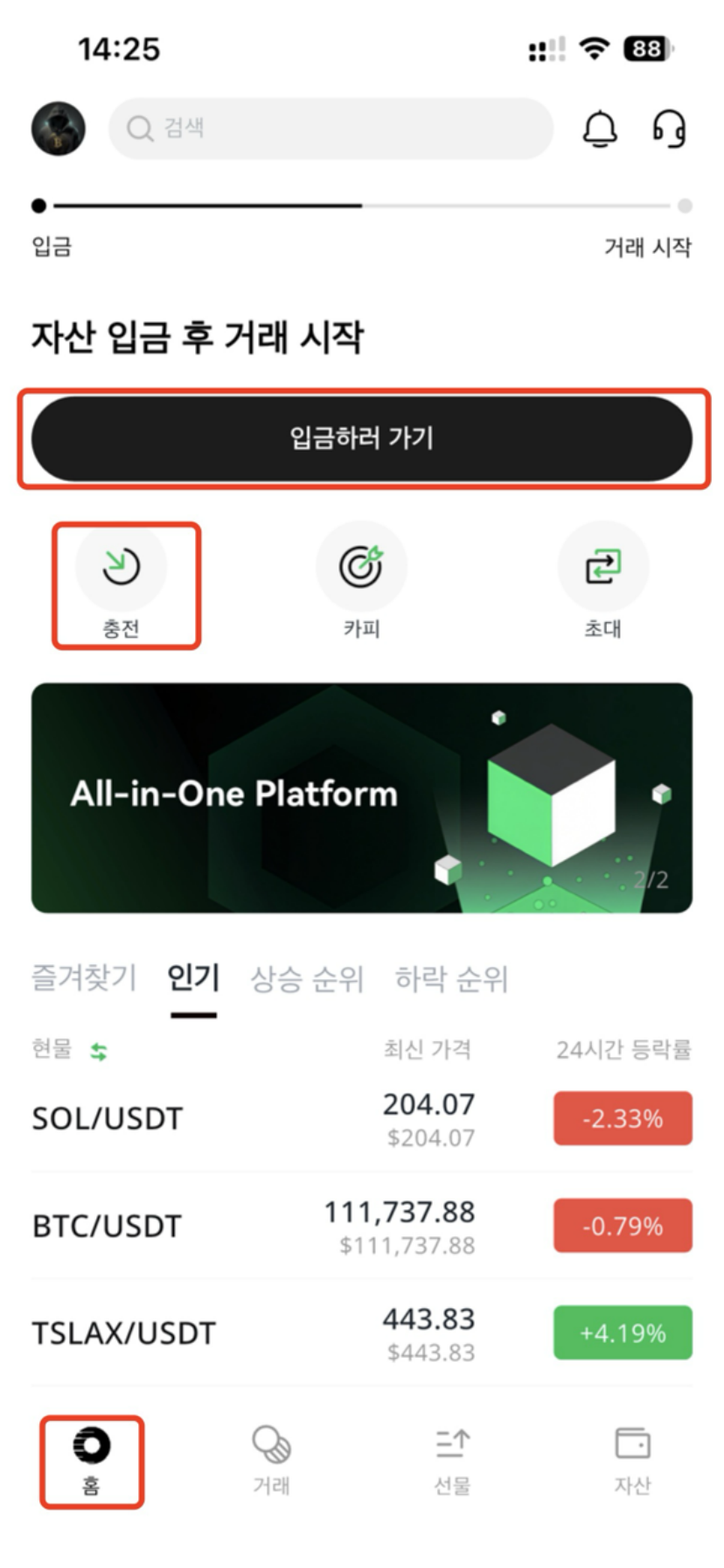 입금 방법 (APP) 2025년 12월 17일 02:09 업데이트 시간 RooEx 앱에 로그인한 후 【홈】에서 【충전】 또는 【충전하기】를 클릭하거나 오른쪽 하단의 【자산】 페이지에서 【충전】을 클릭합니다. 충전 네트워크를 선택합니다.참고: 최소 충전 금액보다 낮은 금액은 충전할 수 없습니다. image.gif 4 메가바이트 다운로드 image.gif 4 메가바이트 다운로드 image.gif 4 메가바이트 다운로드 관련 문서 출금 방법 (APP)