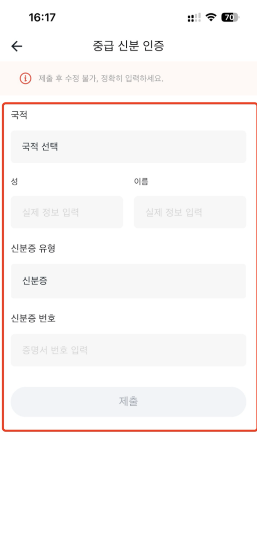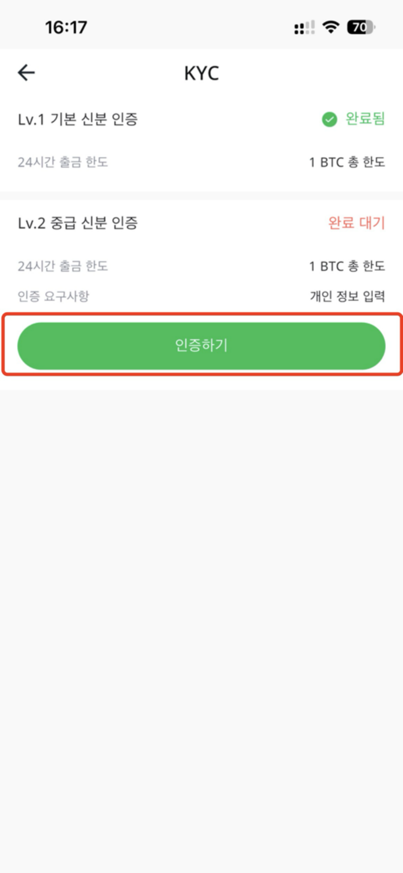 신분 인증 가이드 (APP) 2025년 12월 17일 02:55 업데이트 시간 【홈】 왼쪽 상단의 아바타를 클릭합니다.【KYC】을 클릭합니다.【인증하기】를 클릭합니다.【국적】을 선택하고 실명을 입력합니다. 【신분증 유형】을 선택하고 정확한 【신분증 번호】를 입력합니다. 【제출】을 클릭하면 완료됩니다.참고: 정보 제출 후 수정이 불가능하므로 반드시 사실대로填写하십시오. image.gif 4 메가바이트 다운로드 image.gif 4 메가바이트 다운로드 image.gif 4 메가바이트 다운로드 image.gif 4 메가바이트 다운로드