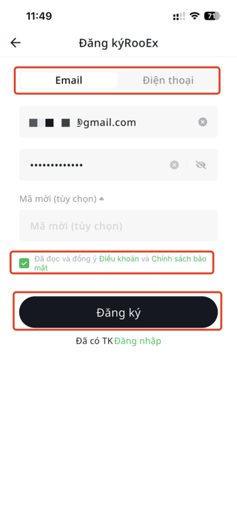 - Nhập 【Email】 hoặc 【Điện thoại 】, đặt mật khẩu bảo mật hợp lệ, sau đó nhấn 【Tôi đã đọc và đồng ý với Điều khoản Dịch vụ và Chính sách Quyền riêng tư của RooEx】, rồi nhấn 【Đăng ký】 để hoàn tất việc đăng ký tài khoản.