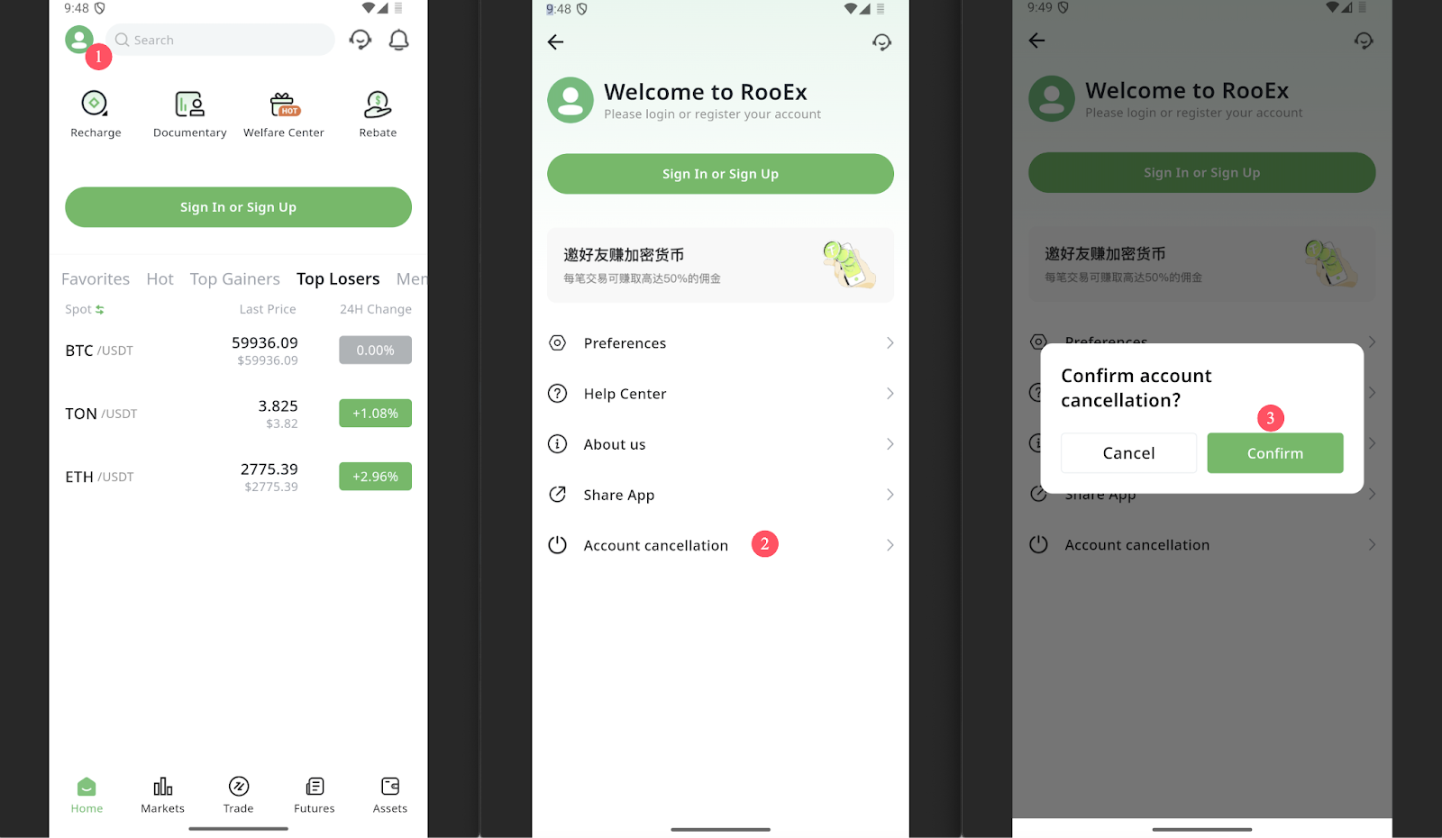 Nếu bạn không muốn tiếp tục sử dụng tài khoản RooEx nữa, bạn có thể hủy tài khoản. Lưu ý rằng, một khi tài khoản đã bị hủy, tất cả dữ liệu tài khoản của bạn sẽ bị xóa hoàn toàn và không thể phục hồi, điều này có nghĩa là nếu trong tài khoản của bạn còn tài sản, bạn sẽ mất chúng vĩnh viễn sau khi hủy.