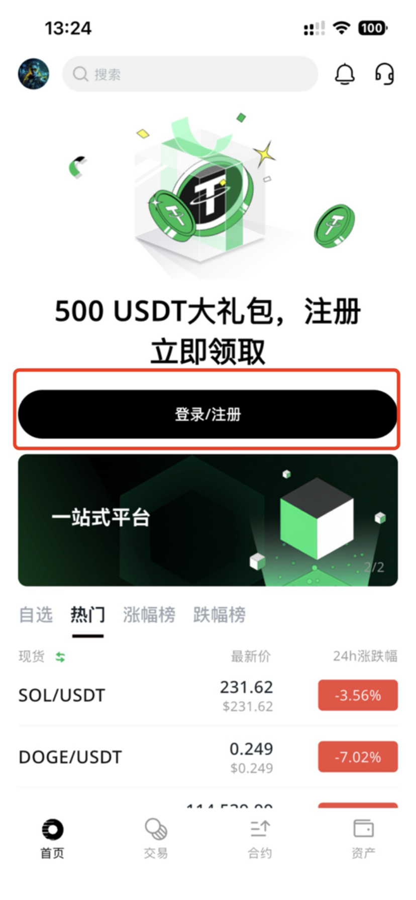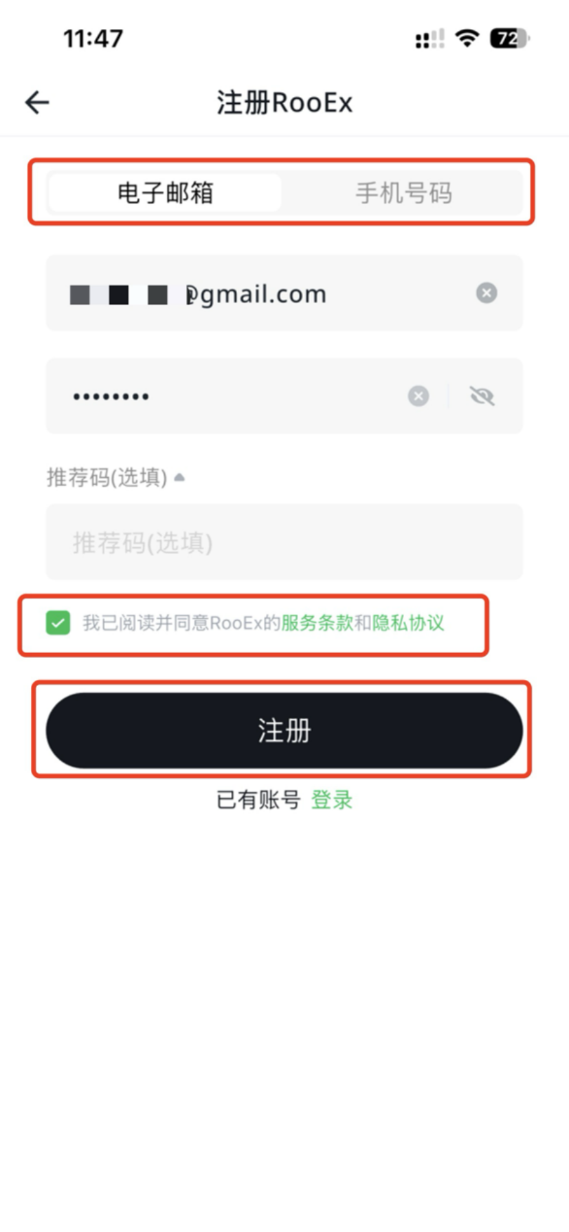 如何注册账户(APP) 2025年12月16日 13:55 更新 打开RooEx app,首页点击【登录/注册】”,开启注册或者登录。输入【电子邮箱】或者【手机号码】,设置有效安全密码,然后点击【我已阅读并同意RooEx的服务条款和隐私协议】,再点击【注册】,即可完成账户注册。 image.gif 4 MB 下载 image.gif 4 MB 下载 相关文章 如何进行充值操作(APP) 如何进行充值操作(网页版) 如何注册账户(网页版) 费率标准 如何邀请好友注册
