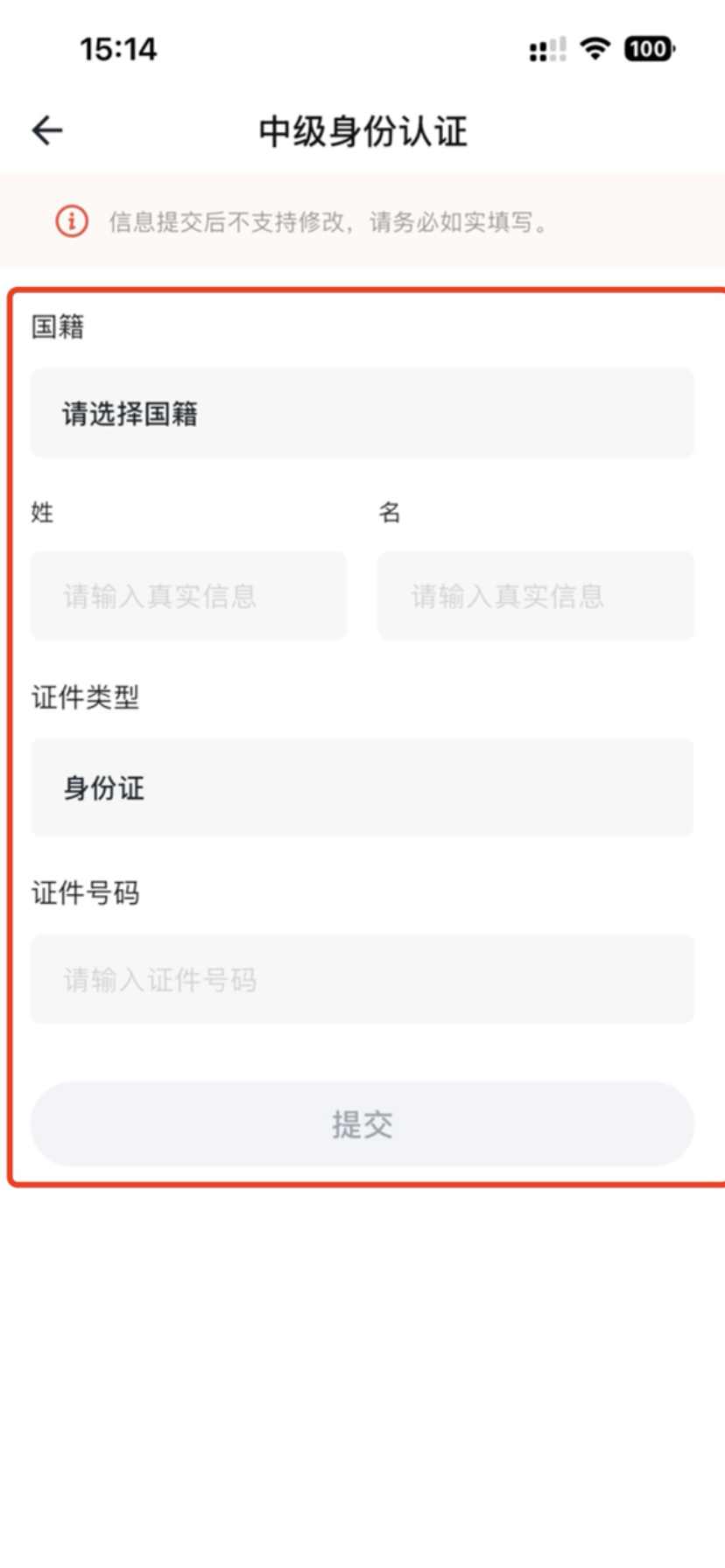 身份认证教程(APP) 2025年12月17日 01:16 更新 点击【首页】左上角头像点击【身份认证】点击【去认证】选择【国籍】,填写真实姓名选择【证件类型】,正确输入【证件号码】点击【提交】即可注意:信息提交后不支持修改,请务必如实填写。 image.gif 4 MB 下载 image.gif 4 MB 下载 image.gif 4 MB 下载 image.gif 4 MB 下载