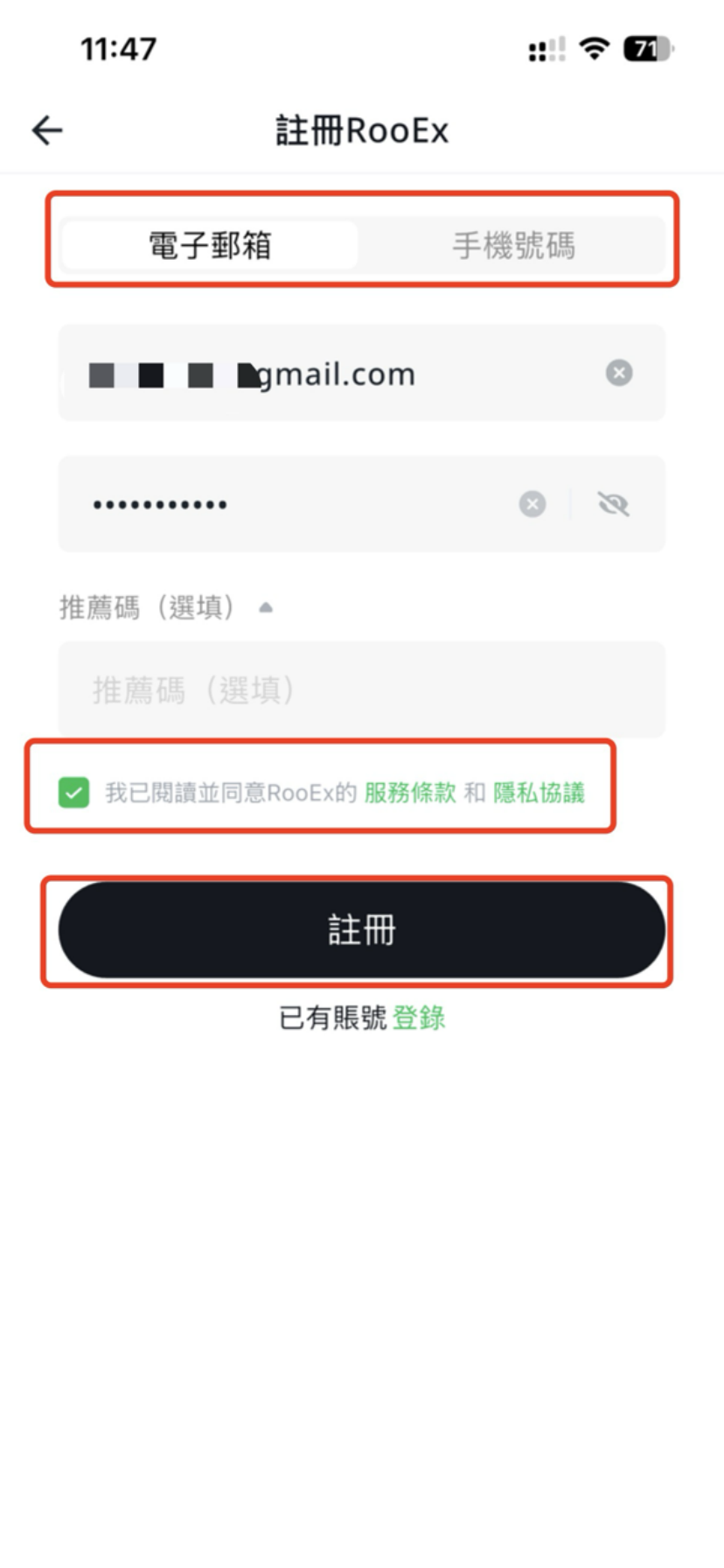 如何註冊賬戶(APP) 2025年12月17日 01:20 更新於 打開RooEx app,首頁點擊【登錄/註冊】,開始註冊或登錄。 輸入【電子郵箱】或【手機號碼】,設定有效安全密碼,然後點擊【我已閱讀並同意RooEx的服務條款和隱私協議】,再點擊【註冊】,即可完成帳戶註冊。 image.gif 4 MB 下載 image.gif 4 MB 下載 相關文章 如何進行充值操作(APP)