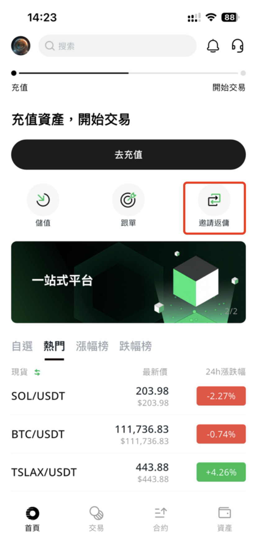如何邀請好友註冊 2025年12月17日 01:26 更新於 登入RooEx app後,可透過以下兩種方式找到【邀請返傭】功能:在【首頁】直接點擊【邀請返傭】入口點擊左上角頭像,在彈出選單中選擇【邀請返傭】 image.gif 4 MB 下載 image.gif 4 MB 下載 image.gif 4 MB 下載 相關文章 如何劃轉