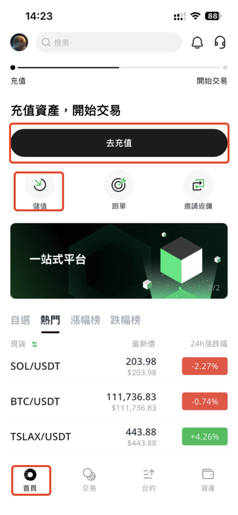 如何進行充值操作(APP) 2025年12月17日 01:21 更新於 登錄RooEx app,【首頁】點擊【充值】或【去充值】;或找到右下角【資產】頁面,點擊【充值】。 選擇充值網絡 注意:不要低於最小充值金額 。 image.gif 4 MB 下載 image.gif 4 MB 下載 image.gif 4 MB 下載 相關文章 如何進行提現操作(APP) 如何註冊賬戶(APP)